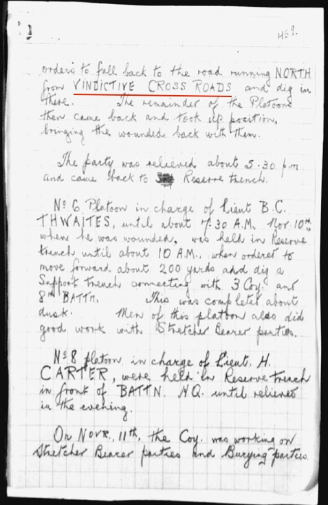 In some cases you’ll encounter a place or trench name rather than a map reference, as is the case in this report attached to the appendix of the 7th Battalion CEF war diary for September 1917 (Figure 4). The entry refers to a road running north from Vindictive Cross Roads: