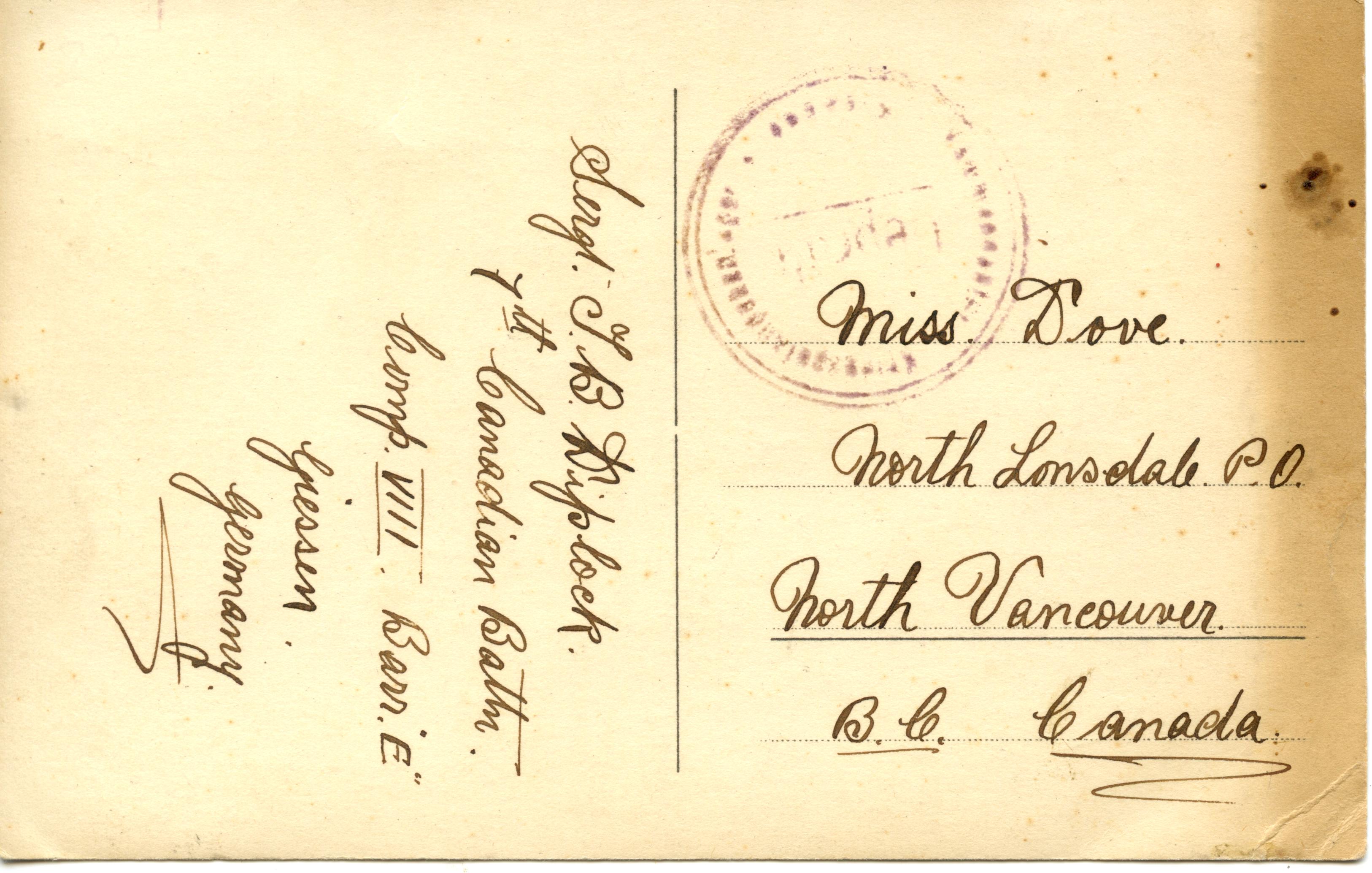 Last July I was contacted by Austin Osman who was researching Sgt. Thomas Diplock after finding this wonderful postcard on eBay. He very kindly brought the listing to my attention which gave me time to contact Thomas’s family in Vancouver. They were thrilled to learn of another family heirloom and asked me to bid on their behalf. I won the auction and the postcard is back where it belongs, with the family.