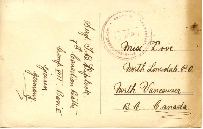 Sgt. Thomas Diplock is standing on the far right in the top row. Unfortunately I’m unable to decipher a date from the postmark on the postcard but Thomas spent nearly three years at the camp in Giessen after his capture at Second Ypres on April 24, 1915. He was transferred to neutral Holland in March 1918 and so the photo may have been taken at any time during that period.