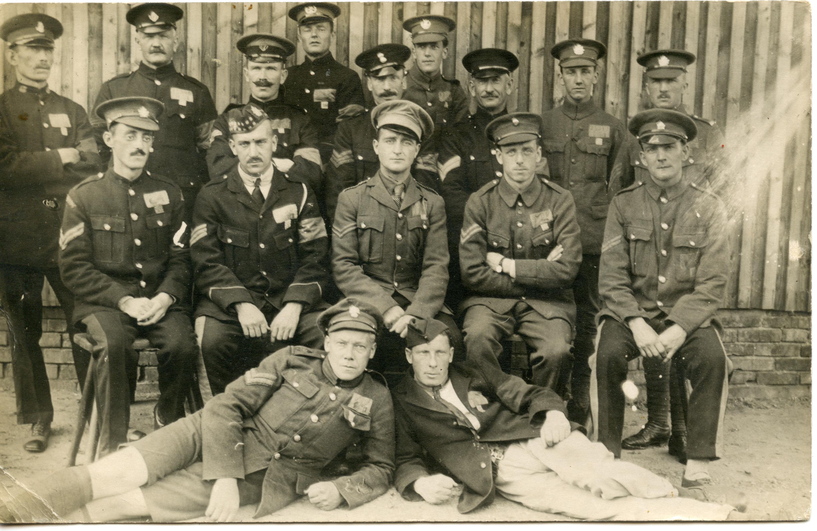 The wide variety of uniforms on display is fascinating. Some of the sixteen men are wearing Kitchener Blues, some without breast pockets or shoulder straps, issued by the British when supplies of khaki ran short in 1914. Do you recognize anyone in this photo? There are a lot of interesting details to study and so I encourage you to add your thoughts either by commenting below or by contacting me. I’ve not had a lot of time to look into this but here are some of my initial thoughts: