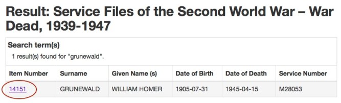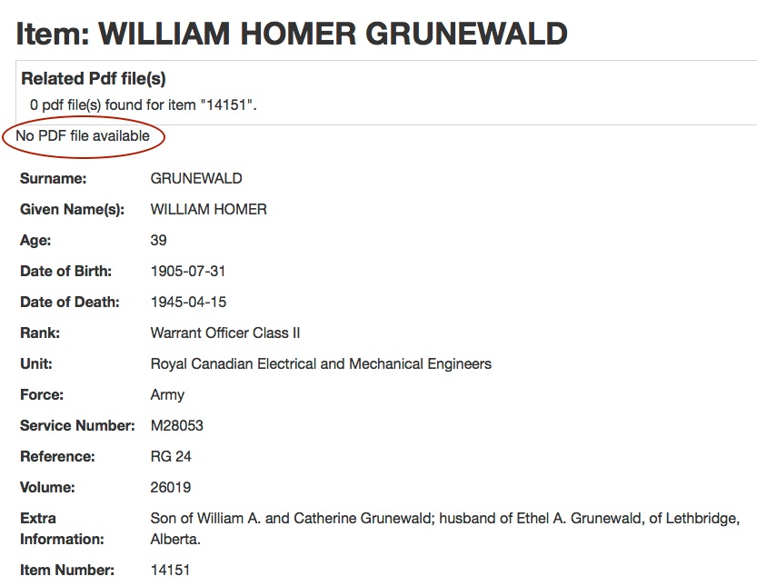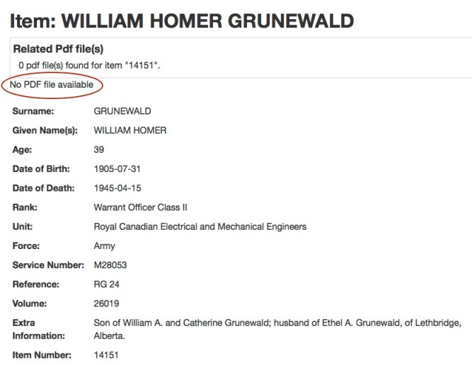 2. If the page indicates “No PDF file available” then the service file is not available directly from LAC but can be viewed for free on Ancestry.ca in their “Canada, WWII Services Files of War Dead, 1939-1947” record set. If you don’t have an Ancestry account you’ll need to create a free guest account but you do not require a subscription. There is an Ancestry page that includes more information on creating Free Accounts.