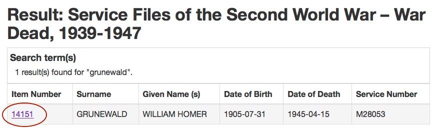 LAC’s Service Files of the Second World War – War Dead, 1939-1947 web page provides a good overview on service files relating to the more than 44,000 Canadians who died during this period. There are no access restrictions associated with viewing these service files. Their page includes a link to a database search option that lets you search for an individual by surname, given name or service number.