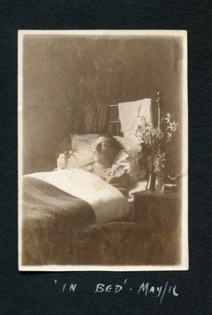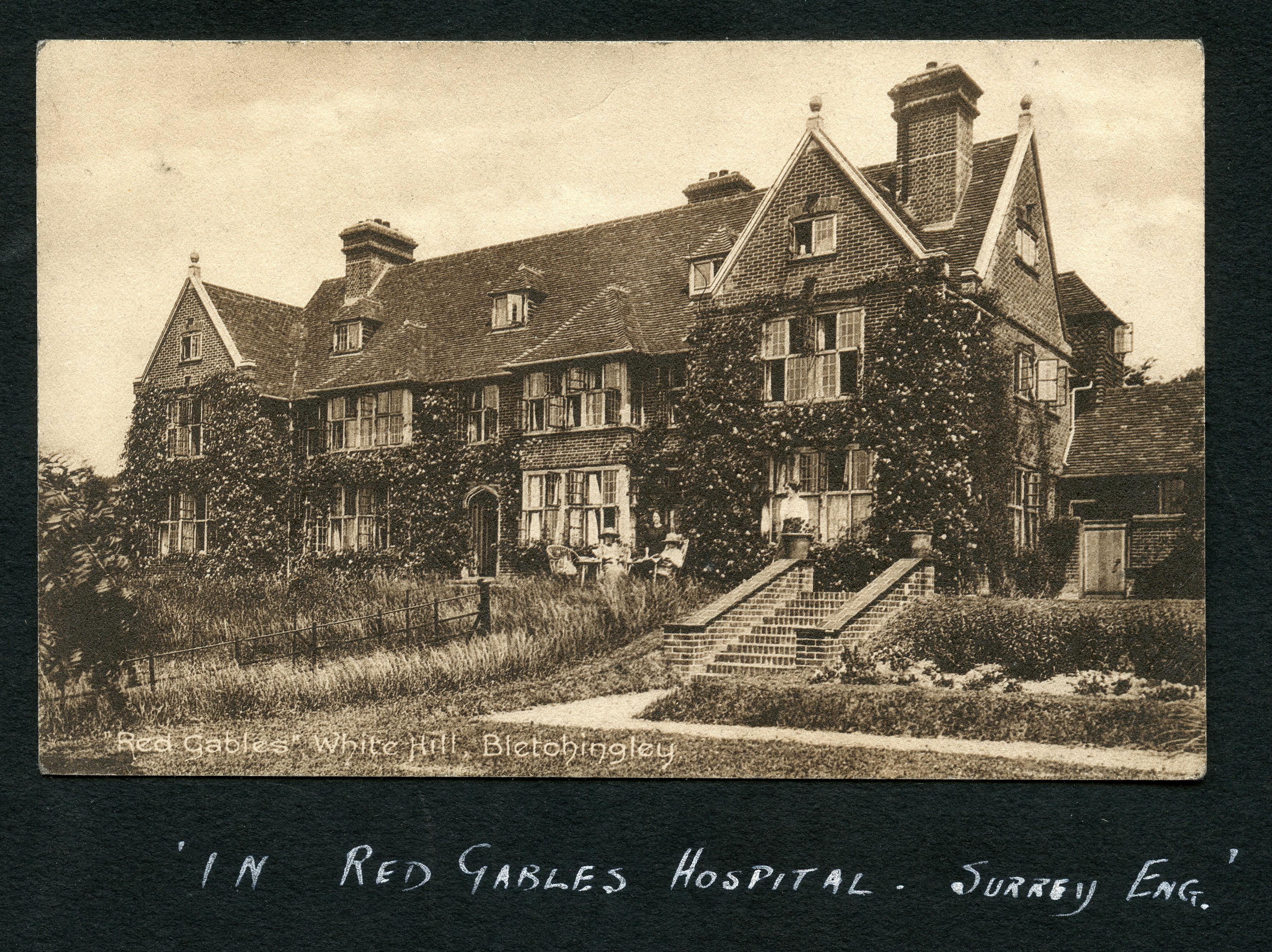 This week I”m featuring a series of photos taken at the Red Gables Private Hospital in Bletchingley, Surrey. The hospital was established by Mr. F.C. Abbott in November 1914 and operated as a convalescence home until February 1919. It specialized in treating men who received fractures of major bones due to shell or gunshot fire. One such patient was Private John Denholm of the 16th Battalion (Canadian Scottish) who was admitted in April 1916 after being seriously wounded in January of that year. I’ve written a dozen articles on Private Denholm and have featured many photos from his amazing First World War scrapbook.