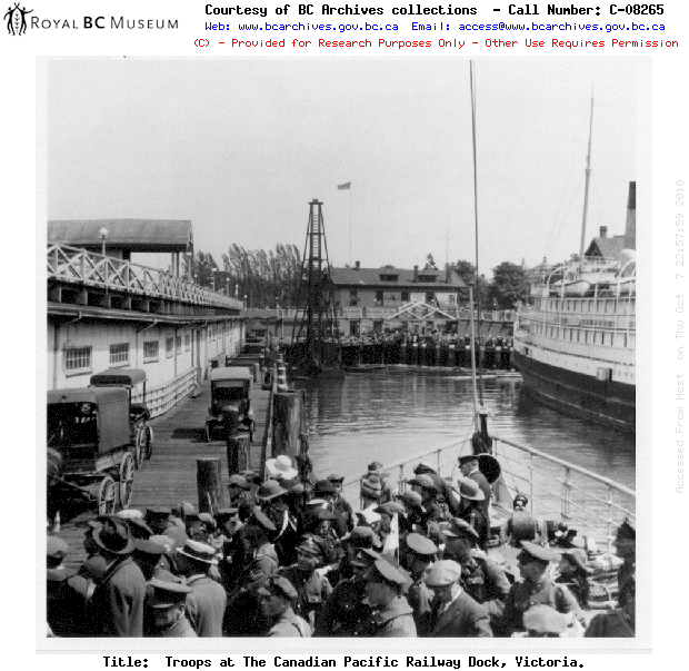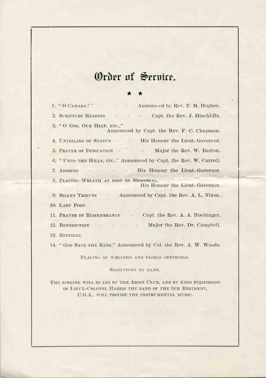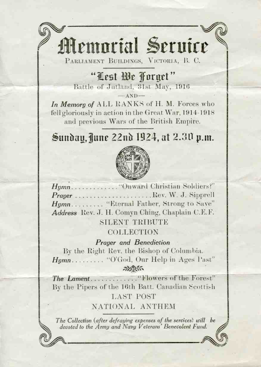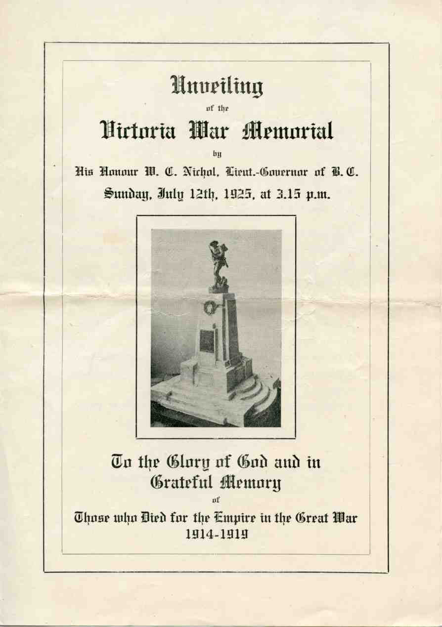 Here are a selection of photos taken in and around Victoria, BC, including scans of the program from the unveiling of Victoria’s War Memorial in 1925. I’ve also included photos from the BC Archives Photographic Images collection.